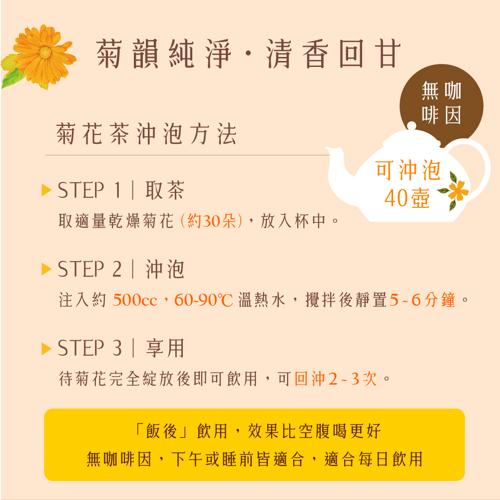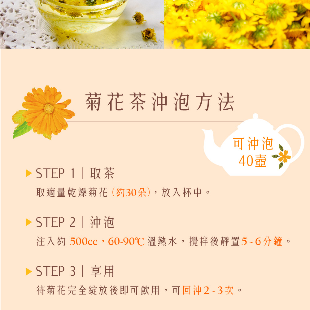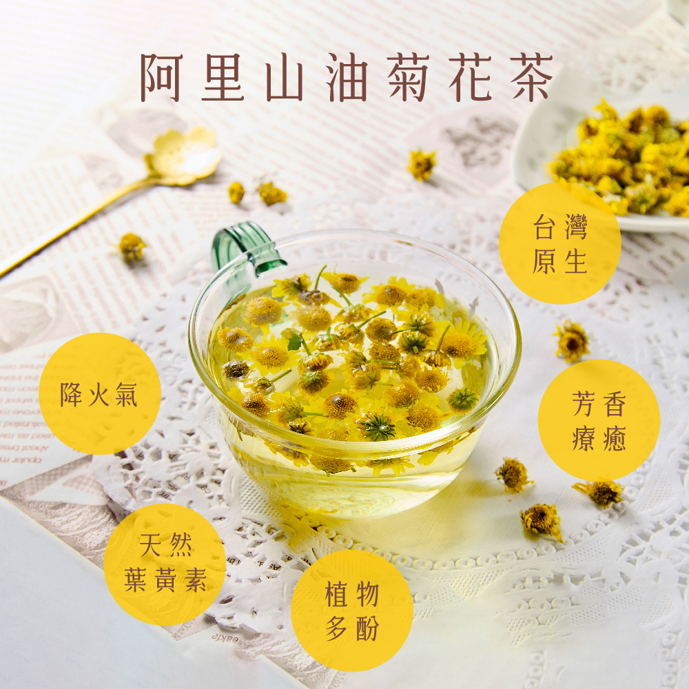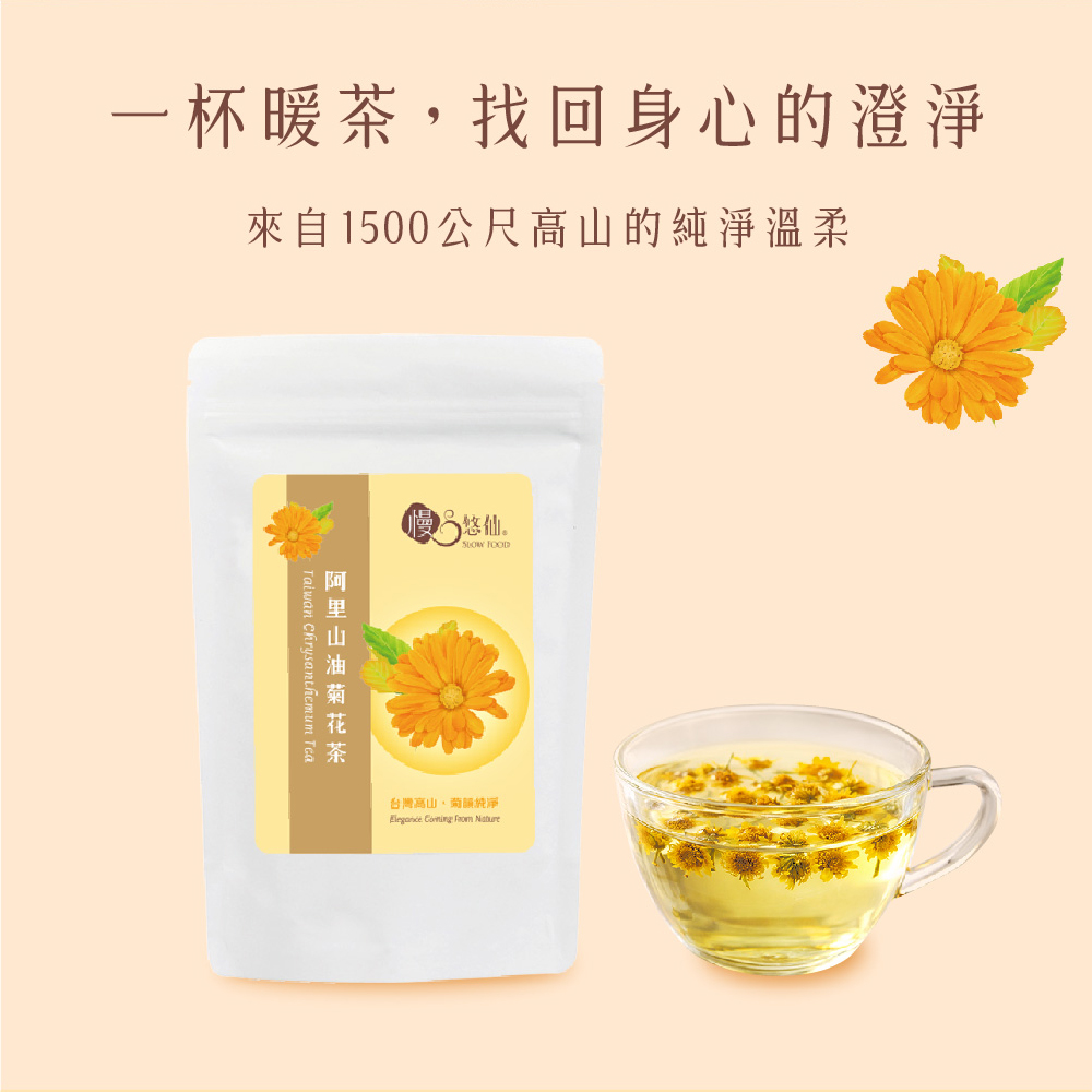 【產品資訊】品名:【慢悠仙】阿里山油菊花茶 25g 袋裝(花瓣)產地:台灣成分:乾燥菊花花瓣規格:25g/袋(每袋可沖40壺)外包裝:鋁箔牛皮紙密封袋保存期限:1年製造日期:詳見於外包裝保存方法:請置於乾燥陰涼處。